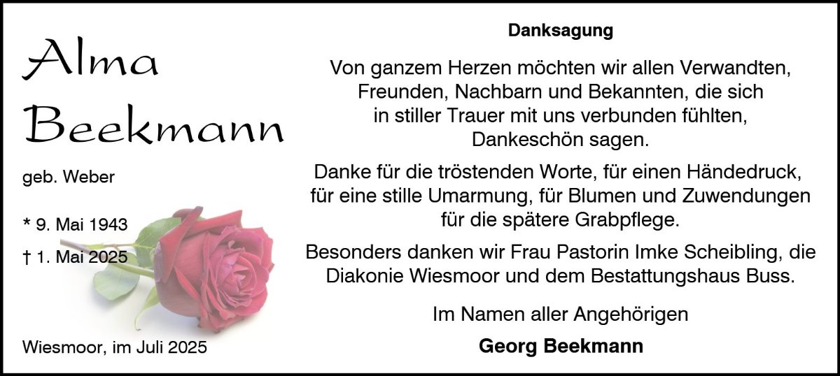 Es haben sich so gute Freundschaften daraus Entwickelt, viel miteinander Telefoniert ,Alma ich möchte dir auf Deiner letzten Reise ,noch ein paar ganz Persoñliche liebe Worte mit geben . Alma du hast immer Zeit für alle gehabt,hast immer ein offenes Ohr gehabt,immer einen guten Rat parat gehabt,liebste Freundin Alma ,aller Beste Zuhörerin,Alma du warst ein wunderbarer Mensch ,liebste Alma ,und wie eine 2 Mama warst du die ganzen Jahre für mich geworden.