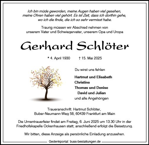 in diesen Tagen fühlen wir mit Ihnen und wünschen Ihnen von Herzen, dass Sie aus den glücklichen Erinnerungen Kraft schöpfen, um positiv in die Zukunft zu gehen. Diese Gedenkseite möge Ihnen dabei helfen, Ihre Trauer zu teilen und das Andenken gemeinsam wachzuhalten.