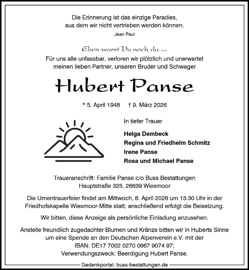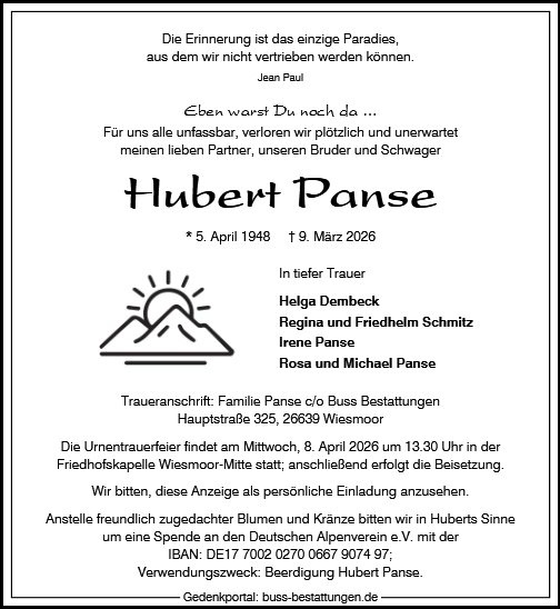 wir wünschen Ihnen von Herzen viel Kraft, dass Sie Menschen um sich haben, die Ihnen in dieser schweren Zeit beistehen und Halt geben. Zusätzlich können Sie auf dieser Gedenkseite Erinnerungen teilen und so das Andenken gemeinsam wachhalten.