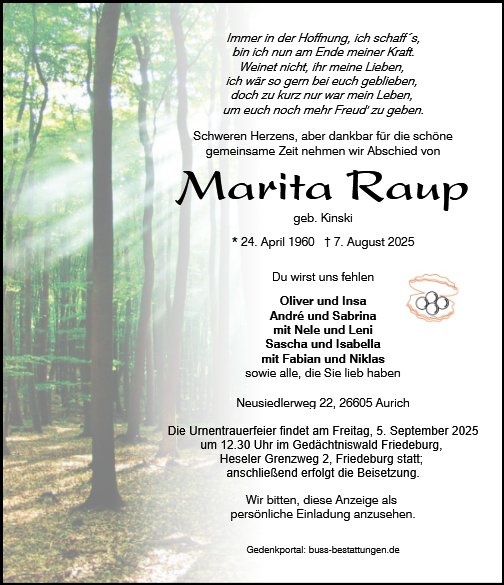 Mit tiefem Bedauern haben wir Kenntnis genommen vom Tod von Marita! Wir sind sehr traurig und wünschen ihrer Familie, zu der wir uns auch zugehörig fühlen, viel Kraft! Wir werden Marita immer in unseren Herzen behalten.